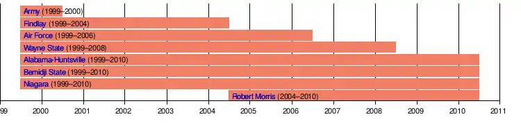 Wayne State UniversityDetroit, MichiganWarriors1999–20082001, 2002, 2003dropped program