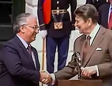 President Ronald Reagan laying a wreath at Simon Bolivar's statue in Bogota in 1982.