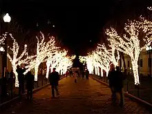 The campus Tree Lighting ceremony was inaugurated in 1998. It celebrates the illumination of the medium-sized trees lining College Walk in front of Kent Hall and Hamilton Hall on the east end and Dodge Hall and Pulitzer Hall on the west, just before finals week in early December. The lights remain on until February 28. Students meet at the sundial for free hot chocolate, performances by a cappella groups, and speeches by the university president and a guest.[15]