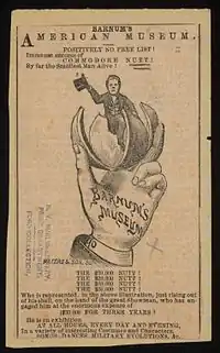 The little men were billed as "The Two Dromios"[18] and "The Two Smallest Men, and Greatest Curiosities Living." The exhibit opened on 11 August 1862.[17] Despite what their eyes witnessed, some museum-goers still said that Nutt was Tom Thumb in disguise. Barnum wrote, "It is very amusing to see how people will sometimes deceive themselves by being too incredulous."[14][19]