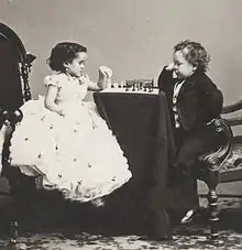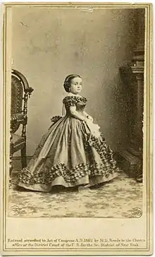 The wedding reception was held in the Metropolitan Hotel on Broadway at 3 pm.[24][25] The four little members of the wedding party stood on top of a grand piano so they could be seen by everyone.[25] Nutt gave Lavinia a diamond ring as a wedding present.[24] Americans loved the wedding. It was welcome relief from the horrors and sorrows of the war.[28]