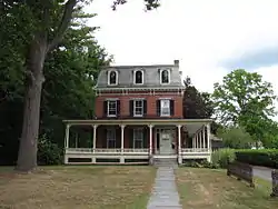 This distinctive brick house was built in 1840 with Greek Revival features, but was remodeled in 1870 with a Second Empire style mansard roof. Ithmar Conkey, for whom it was built, was a prominent local lawyer and businessman, who was also active in regional civic affairs. In 1868, it was acquired by Abiel Stevens, whose wife was the sister-in-law of Sidney Dillon, an executive of the Union Pacific Railroad. Their son Albert worked for the railroad, and used his earnings to refashion the house in the Second Empire style. The house remained in the Stevens family until 1977.[3]