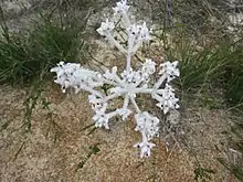 It grows as a prostrate little-branched shrub, the stems densely covered in slender, pointed leaves from seven to 30 millimetres long, and 0.5 to 0.8 millimetres wide. Although prostrate, it has erect flower stalks that give it a height of up to a metre. Inflorescence with numerous clusters of tubular, wooly, white flowers, 6mm long, in winter to spring and occur in elongated panicles. Compounds from this plant are currently being investigated for medicinal use.[2][1][3]