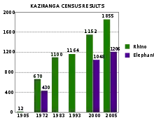 For controlling poaching many steps have been taken by the park authorities including maintenance of existing and construction of new poaching camps, adequate staffing, providing mobility, patrolling, intelligence gathering, firearms and control over the use of firearms around the park.[4] The park has about 122 anti-poaching camps[5] scattered throughout the Park, including two floating camps on the Brahmaputra river. There are 123 country boats, 6 mechanized boats, 4 speed boats (OBM), 2 motor launches, 20 motor vehicles and 47 departmental elephants to assist the anti-poaching squad.[5] There are some 800 personnel, which include about 200 forest guards, game watchers, home guards, forest protection force, and temporary staff who guard the park round the clock.[5] The foresters are provided with 346 numbers of .315 bore rifles, 33 SBBL, 18 DBBL, five revolvers, 20 fixed and mobile wireless stations and more than a hundred walkie-talkies which helps in the anti-poaching activities and in fighting against the poachers.[5] With effective protection methods the number of poaching cases has declined in the park over the past few years.[6]