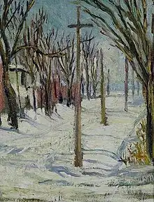 The Group of Seven asserted a distinct national identity combined with a common heritage stemming from early modernism in Europe, including Impressionism and Post-Impressionism.[45] Some of the later members worked as commercial artists at a Toronto company called Grip Ltd. where they were encouraged to paint outdoors in their spare time.[46] As mature artists, Influenced by the example of Tom Thomson, they painted works in the studio from sketches made on small panels while on location in Northern Ontario or in the environment closer to home.[47]