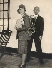 Yolanda Penteado demonstrates the Conversor Marciano; behind, Santos Dumont.