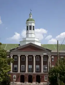 The Board of Education planned to build a two-story brick school with a flat roof.[19] Local citizens associations said the planned school would look like a factory.[19] They preferred a colonial style similar to that of nearby Roosevelt High School.[19] The Manor Park Citizens Association held firm, and the plans were modified to include three stories, a pitched roof, and a cupola.[20][21] Architect Nathan C. Wyeth changed the design to a modern Georgian style.[22]