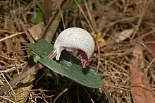Corybas barbarae, commonly known as fairy lanterns,[2] is a species of terrestrial orchid endemic to eastern Australia including Lord Howe Island. It has a single dark green or reddish green, heart-shaped leaf and a small sparkling white or pinkish flower with an inflated dorsal sepal obscuring its hairy labellum.