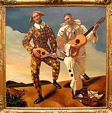 Harlequin in diamonds, and Pierrot in white