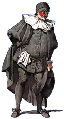 Il Capitano did not have a consistent dress code, but he did have a consistent costume theme. He wore the current soldiers' outfit from a foreign country. Sometimes his clothes were slashed to show that he had been in battle. His hat was overdone and typically had large feathers sticking out of it. Ribbons and shiny buttons often cluttered his clothes. He always carried a sword, and in the seventeenth century the sword upgraded to a gun. Every Il Capitano costume also included a coat or cloak, that he could fling off in a moment of rage or passion.[1][2]