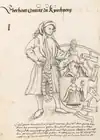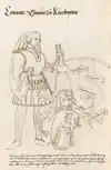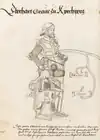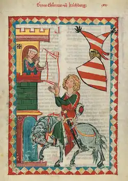 • Conrad of Kirchberg: Konrad is shown on the miniature 24r of the Codex Manesse as a knight (Graue Chunrat vo Kilchberg) who is giving his beloved a poem on horseback. 22 stanzas have survived, divided into three summer and three winter songs, which are reminiscent of Neidhart and Tannhäuser in terms of motif and form.[7] The historical person is uncertain; it is either Konrad (documented between 1255 and 1268) or his son of the same name (documented between 1286 and 1315).[7]