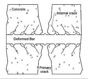 Primary cracks (Figure 1) form when the tensile stress at the outer surface of the concrete reaches the tensile strength of concrete. When a primary crack forms, the concrete in the vicinity of the crack is relieved of any tension, resulting in a stress free zone near the crack.[1]