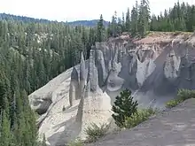 - The Pinnacles: When the very hot ash and pumice came to rest near the volcano, it formed 200-to-300-foot-thick (60 to 90 m) gas-charged deposits. For perhaps years afterward, hot gas moved to the surface and slowly cemented ash and pumice together in channels and escaped through fumaroles. Erosion later removed most of the surrounding loose ash and pumice, leaving tall pinnacles and spires.