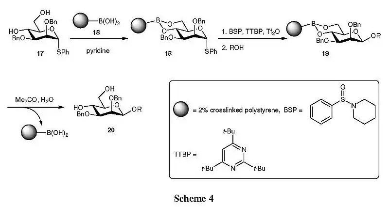 The polymer-supported synthesis of β-mannosides based on the Crich’s protocol has also been studied in the same laboratories.[12] As shown in Scheme 4, diol 17 was first reacted with polystyrylboronic acid (18) to offer the bound donor 19, in which 4,6-O-phenylboronates served as the torsionally disarming protecting group. With that, activation of the thioglycoside 19 was readily achieved, and the coupling reaction with the acceptor alcohol underwent smoothly to provide the bound β-mannoside 20. After removal of the excess reagents and byproducts from the resin, 20 was then treated with aqueous acetone to release 4,6-diol 21. Overall, this is a powerful method for solid-phase synthesis of β-mannosides, which has great potential to be further extended, was established.
