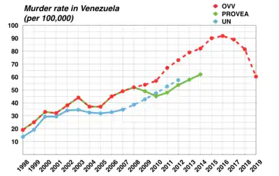 In spite of significant socioeconomic problems, the murder rate in Venezuela decreased between 2017 and 2020. Venezuela's murder rate decreased from 92 per 100,000 in 2016 to 81.4 in 2018, according to the Venezuelan Violence Observatory (OVV), due in part to criminals joining millions of other Venezuelans in fleeing the country.[15] The murder rate declined even further to 60.3 in 2019.[16]