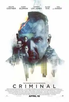 Criminal is a 2016 American action thriller film directed by Ariel Vromen[4] and written by Douglas Cook and David Weisberg. The film is about a convict who is implanted with a dead CIA agent's memories to finish an assignment. The film stars Kevin Costner, Gary Oldman, and Tommy Lee Jones, in the second collaboration among all three following the 1991 film JFK. The film also features Alice Eve, Gal Gadot, Michael Pitt, Jordi Mollà, Antje Traue, Scott Adkins, Amaury Nolasco, and Ryan Reynolds.