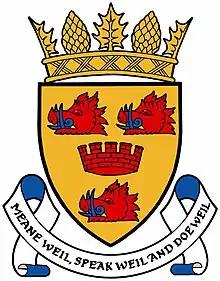 The Cromarty and District Community Council consists of seven members, elected for four-year terms.[12] Three of these members are elected annually to serve as chairman, Secretary and Treasurer.[12] Its coat of arms, granted in 1988, are based on the arms of Urquhart of Cromarty, with a mural coronet placed in the middle of the boars’ heads, signifying a town, and the motto is that of the Urquharts. The official blazon is: Or, three boars' heads erased Gules, armed and langued Azure, in the centre of the shield a mural coronet of the Second. Above the Shield is placed a mural coronet suitable to a statutory Community Council, videlicet:- a circlet richly chased from which are issuant four thistle leaves (one and two halves visible) and four pine cones (two visible) Or, and in an Escrol below the Shield this Motto "Meane Well, Speak Weil, and Doe Weil".