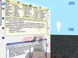 • It provides a complete professional programmer's language (Squeak Smalltalk), integrated development environment (IDE), and class library in every distributed, running participant's copy; the programming development environment itself is simultaneously shareable and extensible