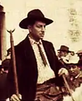 The Camargue cross was designed in 1926 by the painter-illustrator Hermann-Paul (1864–1940),[2] at the request of his friend the marquis-writer-manadier Folco de Baroncelli (1869–1943), considered to be the "Inventor" of the Camargue. After having founded the Nacioun Gardiano association in 1904, to "maintain and glorify the costume, customs and traditions of the country of Arles, the Camargue and the bullfighting countries", he was inspired by the naval anchors to represent with this cross the "Camargue nation" of herdsmen and fishermen.[3][4]
