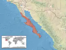 In western Mexico in the north, it is found in the Baja California Peninsula from around Río San Telmo on the west coast and from opposite Isla Angel de la Guarda on the gulf coast, south to Cabo San Lucas. It is also found in the Gulf of California on the islands of San Marcos, Carmen, San José, San Francisco, Partida del Sur, Espírita Santo and Cerralvo. Off the Pacific coast, it is also found on the island of San Margarita. The type locality is "Cape San Lucas, Baja California Sur".[2]
