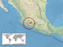 It is found in west-central Mexico in the Sierra de Coalcomán of southwestern Michoacán, the Transverse Volcanic Cordillera of west-central Michoacán, and in adjacent Jalisco. It is probably also found in northeastern Colima. Its type locality is reported as "Tancítaro, Michoacán, Mexico, altitude 5,000 ft" (5,000 ft = 1,524 m).[2] It occurs at elevations between 1,525 and 2,380 metres (5,003 and 7,808 ft).[4]