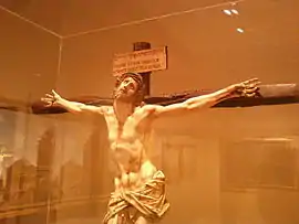 The Crucifix by Spanish artist Gaspar Núñez Delgado, executed in 1599, and now in the Indianapolis Museum of Art, Indianapolis, Indiana. Made of ivory, ebony, mahogany, silver, and polychromy, it displays Núñez Delgado's mastery of human anatomy and human pain.[1]