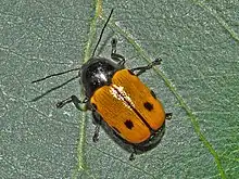 Cryptocephalus trimaculatus can reach a body length of 5.5–8 millimetres (0.22–0.31 in).[3] The body is oval shaped and shiny. The colour of head and pronotum is black, while elytra are orange-red, with three black spots on each elytron. There is a black spot in the front and two black spots in the back. These can be connected to each other in some subject. Abdomen and legs are black. Furthermore, the elytra are longitudinally covered of rows of small black dots. This species is rather similar to Lachnaia italica.[3]