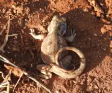 Ctenophorus parviceps, commonly known as the Gnaraloo heath dragon[2][3] or northwestern heath dragon[4] is a species of agamid lizard occurring in pale coastal sands and shell grit with open heaths and beach spinifex, between the North West Cape and Carnarvon, Western Australia and on Bernier Island.[4] The Gnaraloo heath dragon (Ctenophorus parviceps) is a lizard that can be found along the coast of Western Australia between Exmouth Gulf and Shark Bay,[5] and is also known as the northwestern heath dragon.[6] It is native to Australia and usually inhabits sandy coastal dunes. The species' longevity is 3–50 years and its population density is extremely low.[7] The Gnaraloo heath dragon is a member of the Agamidae family, which contains 15 genera. The lizard is under the Ctenophorus genus which has up to 33 species.[8] This genus shows the most morphological and ecological diversity out of the three large agamid genera. 83% of the lizards in this genus lack a crest, while 17% possess crests.[7] They are smaller than most agamids but do have relatively large heads. The Gnaraloo heath dragon can be differentiated from related species by a series of spines on the tail's base, a pale-grey brown broad vertebral band along its back, and hour-glass bars extending upwards to meet the pale vertebral band. It is usually 45mm in terms of length, measuring from snout to vent.[9]