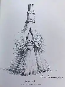 Other traditional breads include Barley bread (Bara barlys), which was traditionally eaten with most meals.[64] Rye bread (Bara rhyg) is a less popular bread and was usually only eaten for medicinal reasons due to the unusual taste and black colour of the flour.[67] Oatcakes (Bara ceirch) were considered to have bodybuilding properties and were a respected addition to the daily diet.[67] Llanover makes the following observation regarding oatmeal:[68]