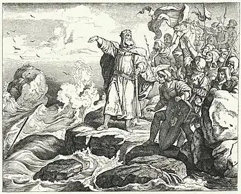 - There are stories about the relationship between Otto and Harald Bluetooth (who, as Otto's vassal, probably converted to Christianity either because Otto forced him to do so or as a calculated move to gain the emperor's friendship).[55][56][57] Reportedly, Otto chased away an invasion force led by Harald, driving them beyond the northernmost point of Jutland and then threw his spear into the North Sea, signalling that this was the limit of the emperor's sovereignty.[58] Ludwig Richter(1803–1884) depicted this scene in an engraving, used as illustration for the book Die deutsche Geschichte in Bildern(1862) by Friedrich Bülau.[59]