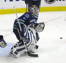 Sanford became an unrestricted free agent in the off-season and on July 3, 2007, the Vancouver Canucks signed him to a one-year, $600,000 contract to back-up starting goaltender Roberto Luongo.[6] He appeared in 16 games in the 2007–08 season, filling in for Luongo mostly in light of his rib injury in December.[7] Posting a 2.83 GAA, he was re-signed to another one-year contract worth $650,000 by the Canucks on July 3, 2008.[8]