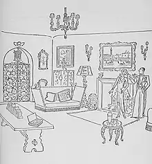 Often mixing antique and modern furniture in the same room, Curzon Street Baroque, has been described as a rejection of Modernism.[8][3] However, as a reformation style, it was more a rejection of the dark and cluttered Victorian style. The opinion of Victorian Architecture and style was at an all-time low, with Osbert Lancaster's fellow wit and contemporary, PG Wodehouse, stating: "It is pretty generally admitted that few Victorians were to be trusted within reach of a trowel and a pile of bricks."[9] Curzon Street Baroque certainly avoided the straight clean lines of Modernism and the dark woodwork of the Victorian era in favour of curves of "overwrought iron and Knole sofas, forests of twisted baroque candlesticks and pickled-oak occasional tables with the early southern-German look inspired by the arty Sitwells."[10] Walls were painted pastel colours, often a shade of green, and where the patrons could afford it, at least one "feature panel" was installed in a room. These were large paintings or murals, often let into the newly repainted panelling, often in the form of trompe-l'œil.[2] In the dining room at Sandringham, the panels were valuable tapestries given by King Alfonso XII of Spain.[11]