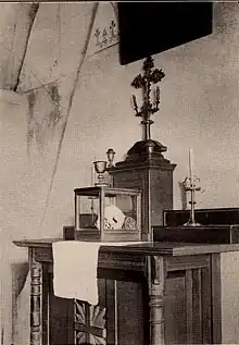 Although the Penal Laws were moderating by this time, there were still no formal Catholic parishes in England. The remaining faithful were served by "missions" where services might be held in a variety of facilities depending on the local situation. The newly ordained Father Haydock's first assignment was a mission established at the home of his sister Mary: Lane Ends House at Mawdesley Chorley Lancashire, where there were hiding places for priests[3] and a secret chapel in the attic.[4]