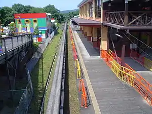 The station had one platform serving one track terminating at the station. The main gate of the station was per se the gate of Japan Monkey Park. The buildings left and right are still in place, and also there is a piece of track with one vehicle on this point. The rest of the line is total gone.