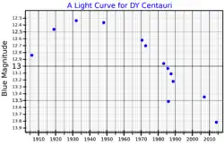 DY Centauri is classified as a R Coronae Borealis variable (RCB), a rare class of supergiant stars which show rapid and irregular decreases in brightness due to the formation of dust clouds on the stellar surface. However, DY Centauri is not an active RCB star anymore, and the last registered obscuration event was in 1934. This seems to be related to evolutionary changes in the star, represented by a very fast horizontal movement across the top of the HR diagram. Spectroscopic and photometric evidence show DY Centuari has increased its effective temperature from 5800 K in 1906 to 24800 K in 2010, while maintaining constant luminosity.[1] As consequence, its visual apparent magnitude has faded from about 11.75 in the beginning of the 20th century to 13.2 in 2010 (due to changes in the bolometric correction),[3] while its radius is calculated to have decreased from 100 R☉ to 8 R☉,[5] and rotation increased 2-fold, approaching critical velocity at which the star could be disrupted.[7] There are only three other known stars with this behavior, called hot RCB stars,[1] The DY Centauri is possibly experiencing an aftermath of the late thermal pulse during the asymptotic giant branch evolution stage.[7]