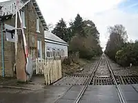 Dalcross station closed on 3 May 1965,[1] and the signal box closed on 12 March 1967.[6] The station building remains however and is now a private residence. The level crossing at the eastern end of the station is now equipped with automatic half-barriers, and is 137 miles 17 chains (220.8 km) from Perth (via Dava).[7]