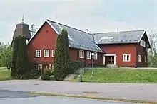 The church combined with the parish house is an L-shaped wooden building.[2] The façade is covered with panelling painted with Falu red. The building has a dual-pitched roof covered with eternit. The church hall has an elevated choir in the southeast end. In the northwest end is a folding wall that can be opened and connect the church hall with the parish house. The construction of the hall, based on glued laminated timber is visible on the interior walls and ceiling. A separate wooden bell tower was built in 1976. The tower is an open construction made of tarred beams with a copper-clad roof.[4][5]