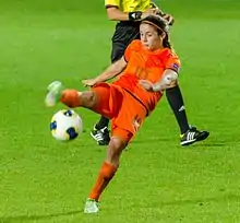 At age 17, Van de Donk first played as a professional football for Dutch Eredivisie club, Willem II. She featured for the Tricolores for the next four seasons, playing in 47 competitive league matches and scoring five goals.[2][7] During her first season in 2008, she played eighteen of the 24 matches and scored one goal. In her second season, she suffered an anterior cruciate ligament (ACL) injury, which kept her off the field for several months.[8] She made seven appearances for Willem II during the 2009–10 season and the club finished in third place with a 8–10–2 record.[2] During the 2010–11 season, she scored four goals in 21 matches playing as a starting midfielder.[2]