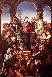 Maclise's vast painting of The Marriage of Strongbow and Aoife (1854) hangs in the National Gallery of Ireland, Dublin.[7] It portrays the marriage of the main Norman conqueror of Ireland "Strongbow" to the daughter of his Gaelic ally. By the grand staircase of Halifax Town Hall, which was completed in 1863, there is a wall painting by Maclise.[8][9]