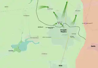 On 29 January, rebels advanced near Al-Suhayliyyeh and Dilli, capturing farms adjacent to the northern part of Shaykh Maskin. However, according to Al-Masdar, the Army recaptured the Faroun Storage Facility and positions in Dilli after these initial gains. The same source also claimed that the Army repelled a rebel attack on Al-Atash village.[6] Two days later, the Army launched a counter-offensive on Brigade 82, claiming that it recaptured the Oxygen Plant and Niqta Al-Masarat and advanced to the base's northern entrance in its outskirts. However, the Army was forced to retreat from the north of the base "in order to regroup". Meanwhile, rebels advanced in Dilli village towards the centre.[7] On 31 January, an Al Jazeera film crew visited the Brigade 82 radar base in the northwest of Shaykh Maskin, confirming that the base was taken during the initial phase of the offensive.[3]
