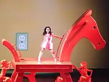 "Dark Horse" was first performed at the iHeartRadio Music Festival in Las Vegas on September 20, 2013.[85] It was later performed at the iTunes Festival in London.[86] Perry also performed the song with Juicy J at the We Can Survive event at the Hollywood Bowl on October 23.[87] Perry also performed "Dark Horse" on The Voice of Germany on December 13, 2013.[88] Perry and Juicy J performed the song at the 56th Annual Grammy Awards on January 26, 2014. The "dark and mysterious" performance featured a "haunted forest" design with animatronic horses, broomstick pole dances, and a controlled fire.[3] The singer also performed the song at the 2014 BRIT Awards and the performance featured a neon-colored Egyptian theme, like the music video.[89]
