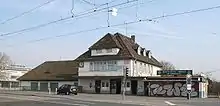 The flyover of Frankfurter Straße runs parallel to the alignment of the Darmstadt Nord station building over the tracks; bus and tram services operate over it.