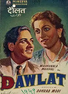 Dawlat (transl."Money") is a 1949 Indian comedy film[1] directed by Sohrab Modi, produced by Minerva Movietone and starring Madhubala and Mahipal in lead roles.[2] The music for the film was composed by Hanuman Prasad. It revolves around a young man trying to impress a rich father in order to marry his beautiful daughter.[3]