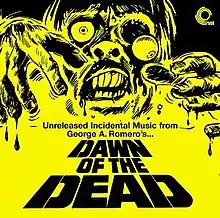 Much of the music used in the film was licensed from the De Wolfe Music Library, a much-utilized source of stock music for film and TV projects. Although the Goblin score has been variously available since the film's release, it was not until 2004 that any of the highly sought-after 60-plus cues of library music used in the film were released on a compilation album from Trunk Records. In 2009, virtually all the cues used (actually 74 of a total 86 library music pieces) were researched, identified and catalogued by Robert McLaine, Darren Stuart, John Toman, Allen Lighthiser, Patrick J. Doody, Llyswen Vaughn and Chris Stavrakis, and published on the Dawn Of The Dead Ultimate Soundtrack website.[1] The album included 'Cause I'm a Man' written by Cliff Twemlow and Peter Taylor under the pen name Peter Reno and recorded by the Pretty Things under the name "Electric Banana", and Herbert Chappell's 1965 composition "The Gonk" which plays over the final credits.[2] The track is used in many references to the film including Shaun of the Dead and a variation (performed in chicken clucks) is used as the end theme to Robot Chicken. The early part of the tune to "The Gonk" was used in "The Ladies' Bras", a track by Jonny Trunk and Wisbey which, at only 36 seconds long, became the shortest ever UK top 40 single when it made number 27 on 30 September 2007. Shaun of the Dead opens with the track "Figment" which also features on the compilation. The album's cover is taken from a Belgian promotional poster for the film.