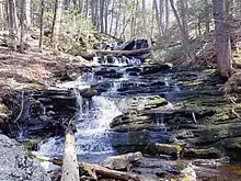A multi-drop waterfall can be found along Day Pond Brook, dropping a total height of 40 feet (12 meters). The falls were once not well known and could not be accessed without bushwhacking. But in 2010, a spur trail was created by a Boy Scout to provide easier access to the falls for the public.[7]