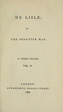 De Lisle is an 1828 novel by the British writer Elizabeth Caroline Grey, originally published in three volumes.[1] It is part of the then-fashionable genre of silver fork novels set amongst the British upper classes during the later Regency era. It revolves around the marriage of the protagonist Hubert De Lisle to Lady Rosamond Trevannon. Although a good and faithful wife, her increasingly neurotic husband becomes extremely suspicious of her.[2]