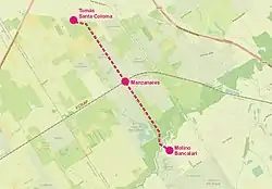 The route led from the Tomás Santa Coloma station (built by the "Tranvía Rural" company, property of the Lacroze brothers to serve the mill) on today's Camino de Rio Hondo and the Camino de El Trébol through the village of Manzanares in a southeasterly direction. In the area of the Luján River the route crossed a high and narrow dam and several watercourses, in particular using a steel bridge over the Arroyo Las Flores. Finally, it crossed the Luján River on a brick dam and ended at the Bancalari mill.[2][6]