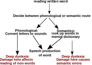 Researchers believe that "failure of inhibition" has no effect on implicit processing, but instead is the cause of impairments in the explicit task of speech production.[21] They believe that explicit characteristics of reading involve only the conscious production of speech (reading).[21] Information about written words is internalized without awareness (implicitly); the ability to access this information and process it into words that can be read or spoken is an explicit process. Implicit knowledge involves phonological awareness, understanding of the morphology, and a semantic understanding of written words.[21] This implicit aspect of reading may be completely intact, and yet reading errors can still occur through defects in explicit output, or production.[21] Researchers have studied the dissociation of implicit and explicit processes to thus unravel the underlying deficiencies in deep dyslexia. Studies in support of "failure of inhibition" show intact implicit processing of deep dyslexics.[21] For instance, studies have shown deep dyslexics that are equally fast in a lexical decision task with a rhyming pair of words (book-took) in comparison to a non-rhyming pair of words (bough-tough), indicating that the patients are able to use implicit phonological knowledge and phonics to process the words.[21] Additionally, they are faster in a lexical decision task with words that sound like they are spelled (couch, pouch) than they are with words that do not sound like they are spelled (touch), again showing that patients are using phonology.[21] These data show that implicit processing is in fact occurring in deep dyslexic patients. Thus, some researchers believe that the impairments present in deep dyslexics are only in explicit phonological output (i.e., reading aloud).[21] They believe that the problems of deep dyslexics are due to production errors, and that deep dyslexics have normal phonological processing at the implicit level.[21] This is supported by the fact that deep dyslexia is often present in patients with production errors resulting from Expressive aphasia.[18]