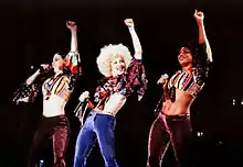 "Deeper and Deeper" has been included on three of Madonna's concert tours: The Girlie Show (1993), Re-Invention (2004), and Rebel Heart (2015―2016). On the first one, it was sung after "Express Yourself" (1989); the stage was decked in Mylar curtains and glittering disco balls.[91] Madonna wore a blond afro wig, 1970's style halters, and royal blue bell-bottom pants, a look that, according to Guilbert, was inspired by actress Marlene Dietrich in the 1932 film Blonde Venus.[92] The performance began with a male member of the audience jumping onstage, trying to dance with a startled Madonna; he then ripped his tearaway pants, revealing himself as one of the concert's dancers.[93] On his review of the concert at New York City's Madison Square Garden, Jon Pareles from The New York Times pointed out that the number was part of the "core of the show", which included songs about "freeing desire".[91] The performance recorded on November 19, 1993, at the Sydney Cricket Ground, was included on The Girlie Show: Live Down Under home video release (1994).[93]