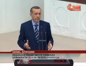 On the same day, Prime Minister Recep Tayyip Erdoğan called on parliamentary deputies to support the democratic initiative in respect to pluralist structure of the first Turkish Parliament, which commanded the country's independence war in the early 1920s. “Parliament is the stage where all issues will be frankly and freely debated. This Parliament cannot fall behind Mustafa Kemal Atatürk's Parliament. We cannot sacrifice the basic principles that were based on pluralism, freedom and democracy 89 years ago," Erdoğan said in his long-speech he delivered at the special session. Atatürk established diplomatic relations with the occupier countries as soon as the war was over, Erdoğan said, repeating his famous remark, “Peace at home and peace in the world.” The final aim is to reach national unity and brotherhood. It is a process of democracy,” he said while describing the move. The deputies representing the Republican People's Party (CHP), later left the parliamentary hall in protest. CHP leader Deniz Baykal commented that Erdoğan's Justice and Development Party was trying to divide the country. Erdoğan stated that he would travel to all 81 provinces to explain the content of the democratic initiative. He also accused the main opposition party CHP and the Nationalist Movement Party (MHP) of ignoring the citizens in eastern Anatolia. “The difference is richness,” he said.[15]